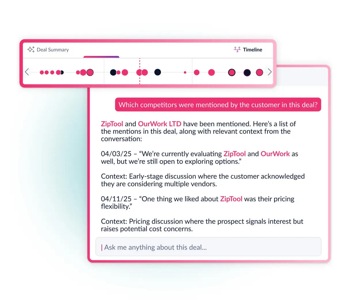 Pipeline reviews just changed forever. Ask Jiminny anything about an open or closed deal so you can keep deals moving or learn from what's closed: