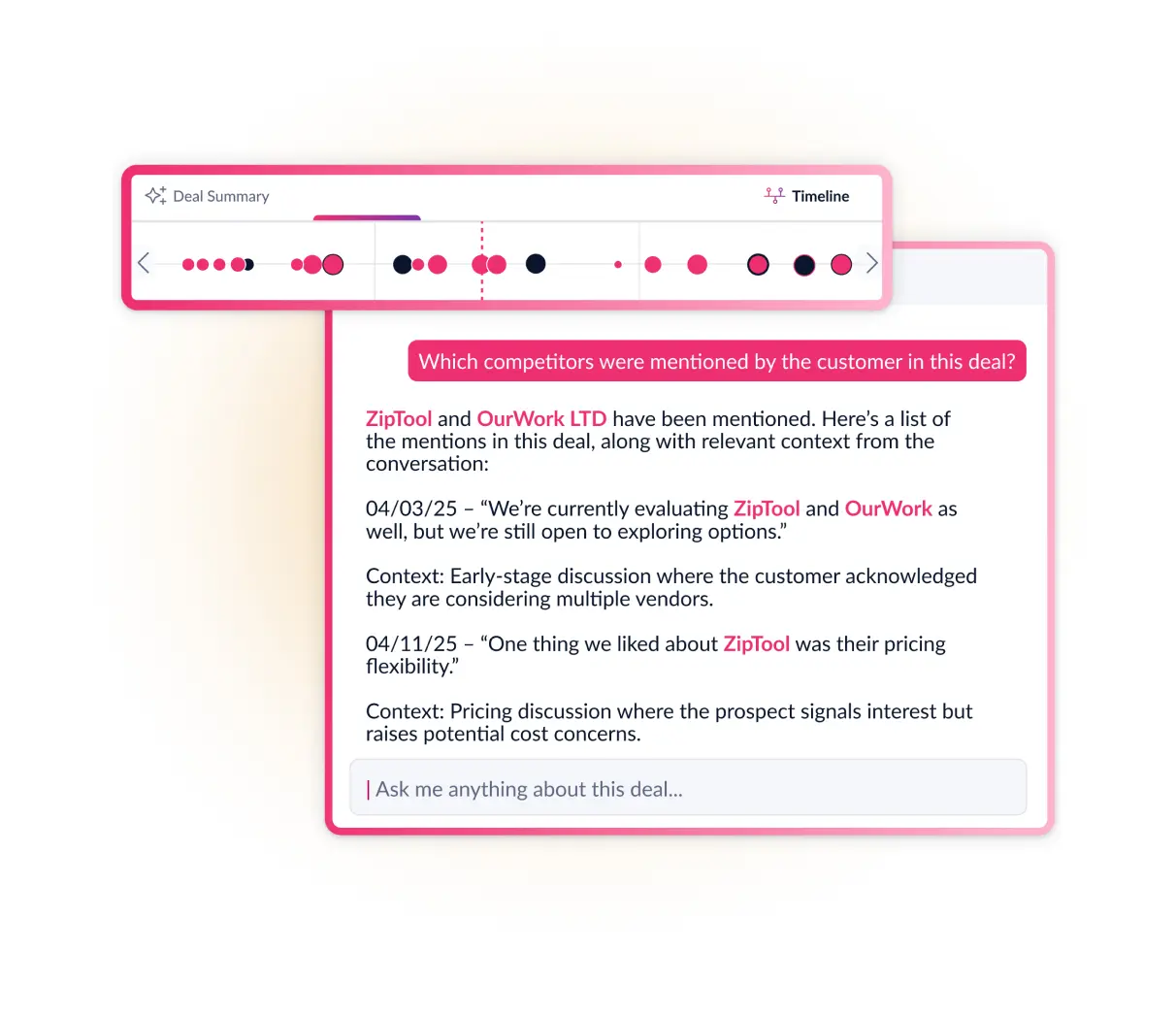 Jiminny’s Deal Insight Dashboard is the core of our pipeline management software. Deal data and conversation intelligence are combined to give you a crystal-clear view of your pipeline. Whether you're looking at deals closing this week or analyzing Closed Lost opportunities, Deal Insight gives you the clarity you need to take decisive action.